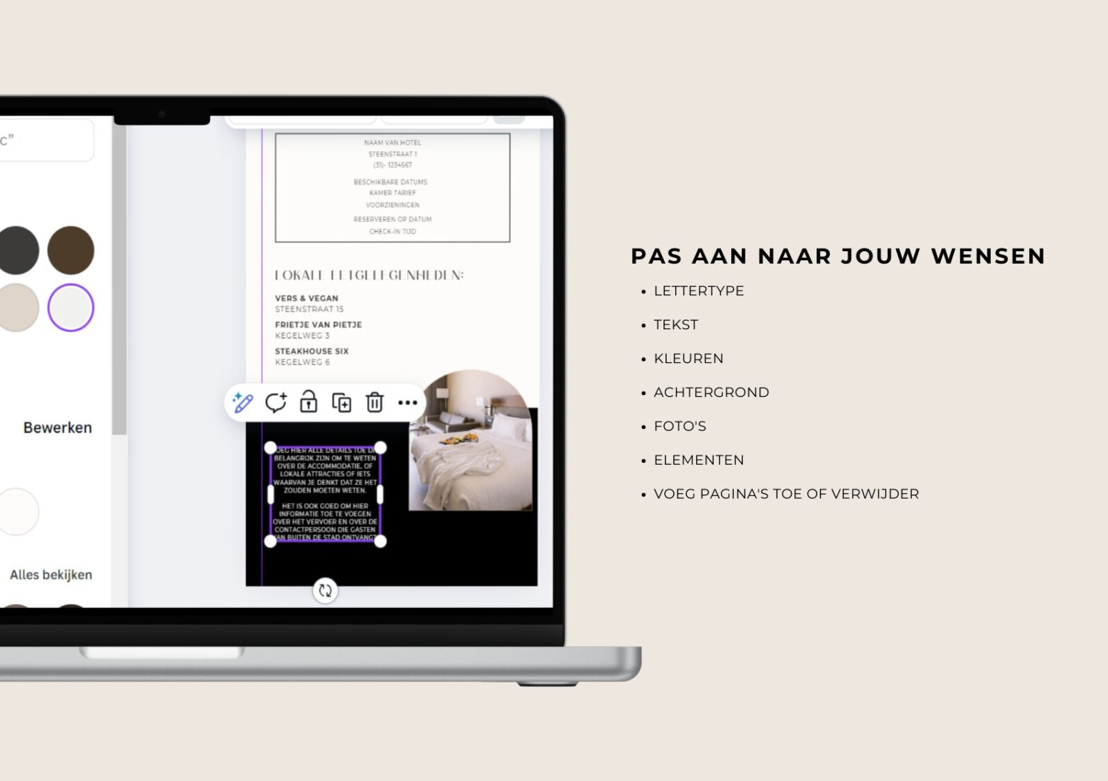 Deze bewerkbare sjabloon, speciaal ontworpen voor Canva, geeft je de mogelijkheid om alles volledig naar wens aan te passen. Kies je eigen kleuren, lettertypes en afbeeldingen, zodat je persoonlijke trouwgids perfect past bij jullie bruiloftsstijl.